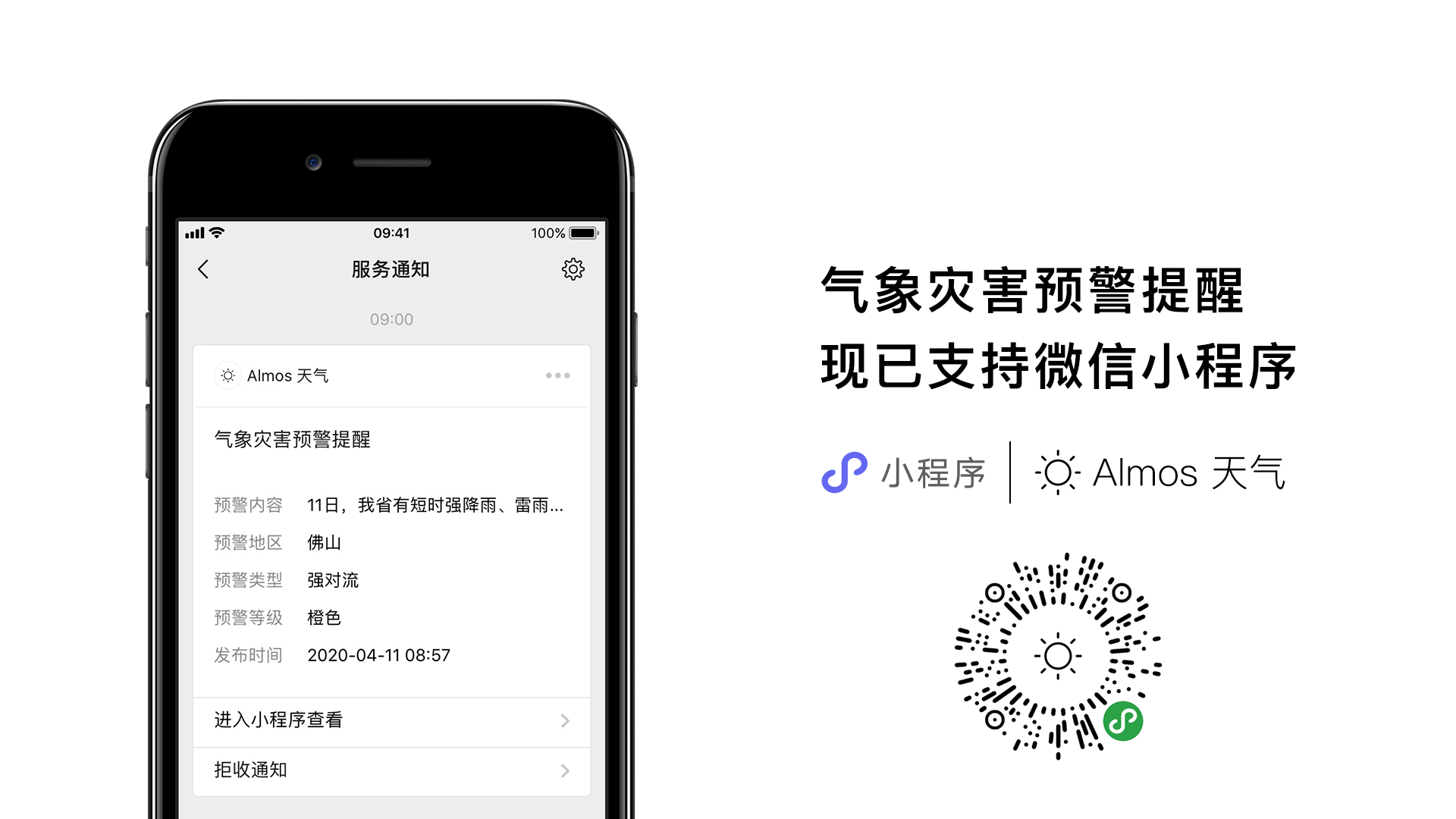 Almos 天气今日推出小程序消息订阅服务,用户可通过小程序订阅天气提醒和气象灾害预警提醒。